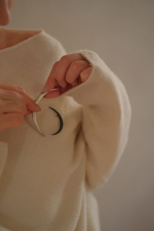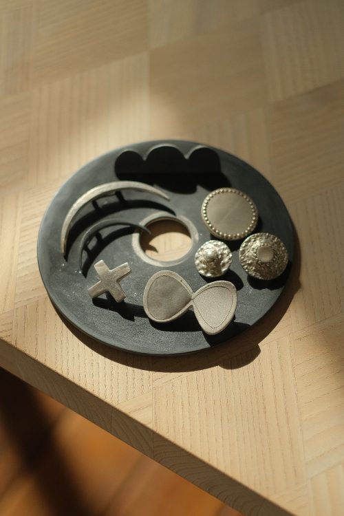 松本さんのブローチは陶器に銀の入った釉薬をかけて焼き上げた「銀彩」という手法で作られています。