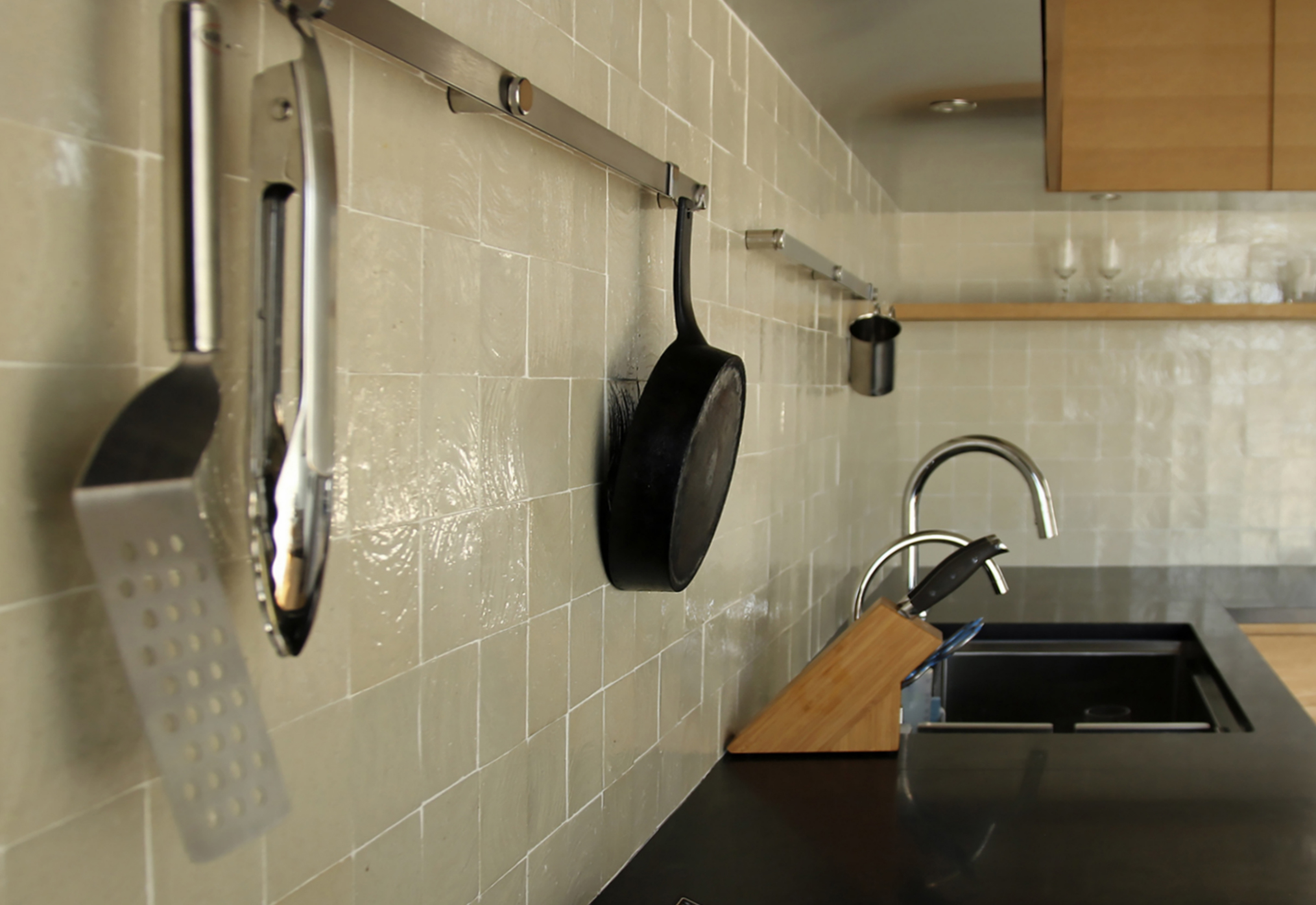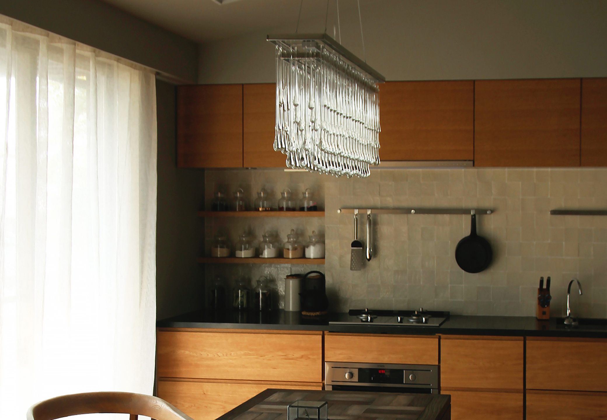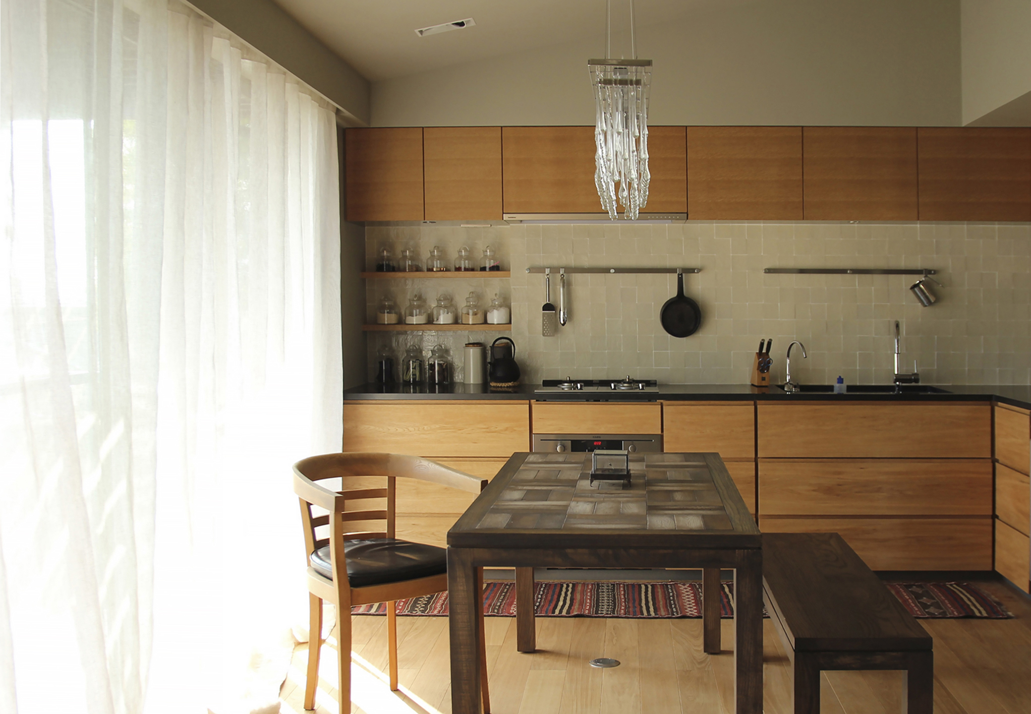 キッチンのタイルと壁の色味を合わせることで、空間に一体感が感じられ、落ち着きがありながらも洗練された印象を与えます。