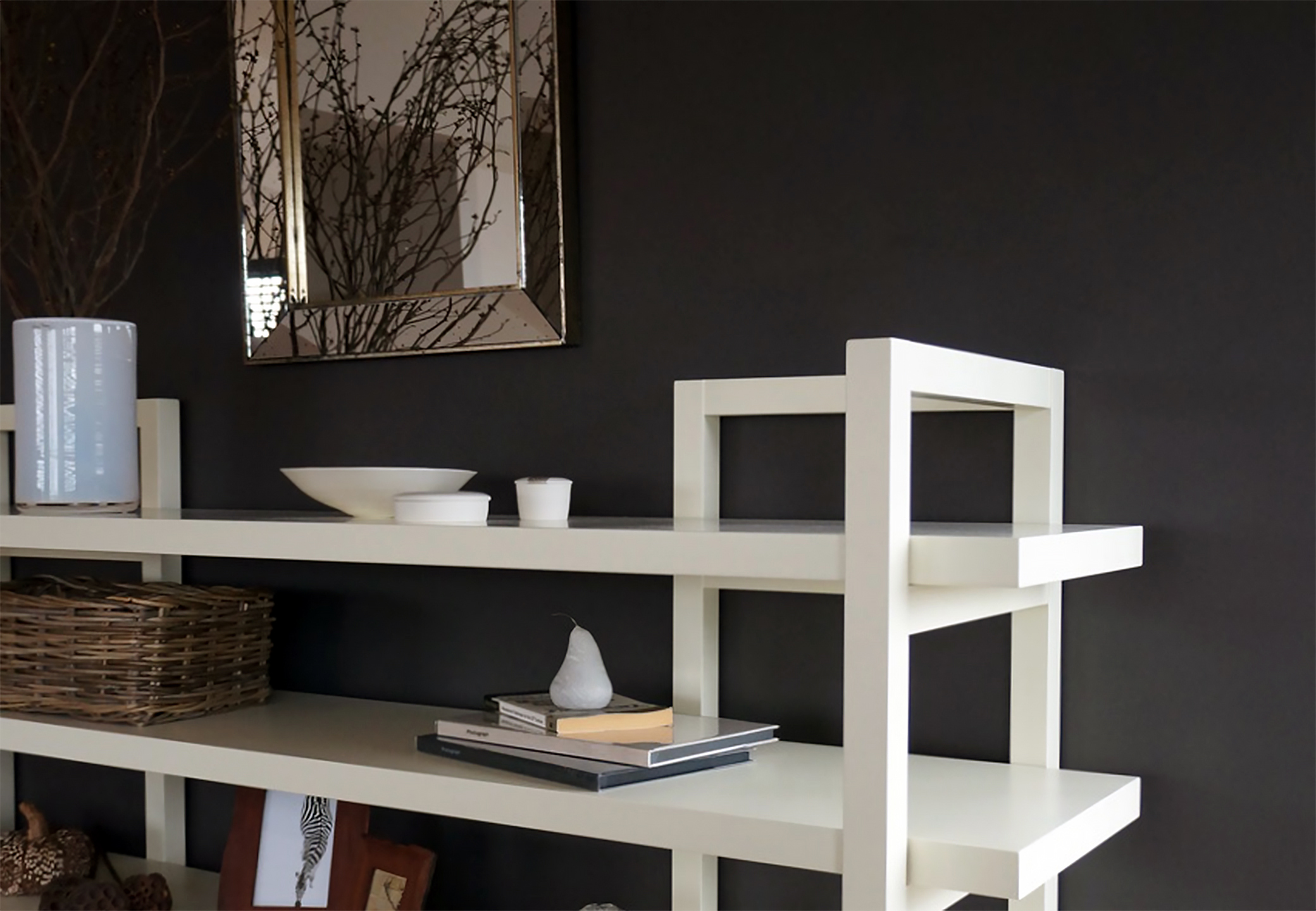 ダークな壁に映える白いオープンシェルフはオリジナルです。