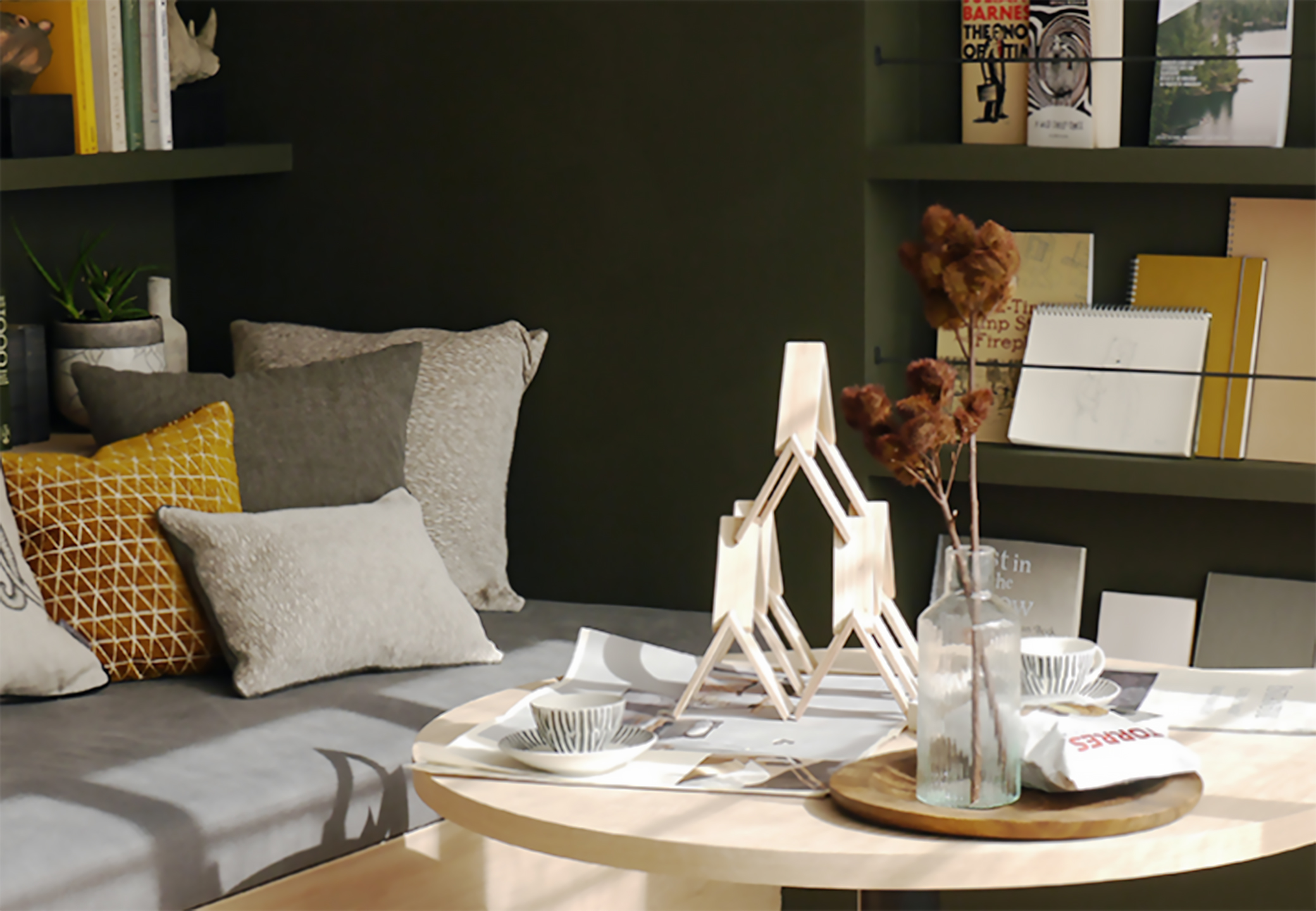 彩度の低い深い色合いのグリーンは、グレーやイエローなどの明るいカラーと合わせることで全体的に暗くなりすぎず、大人っぽいシックな雰囲気を演出します。